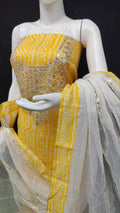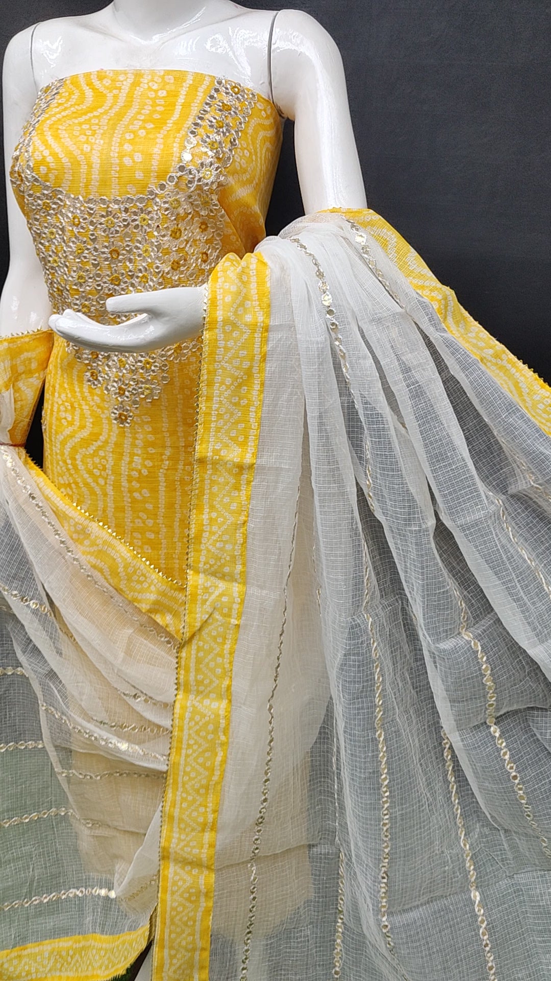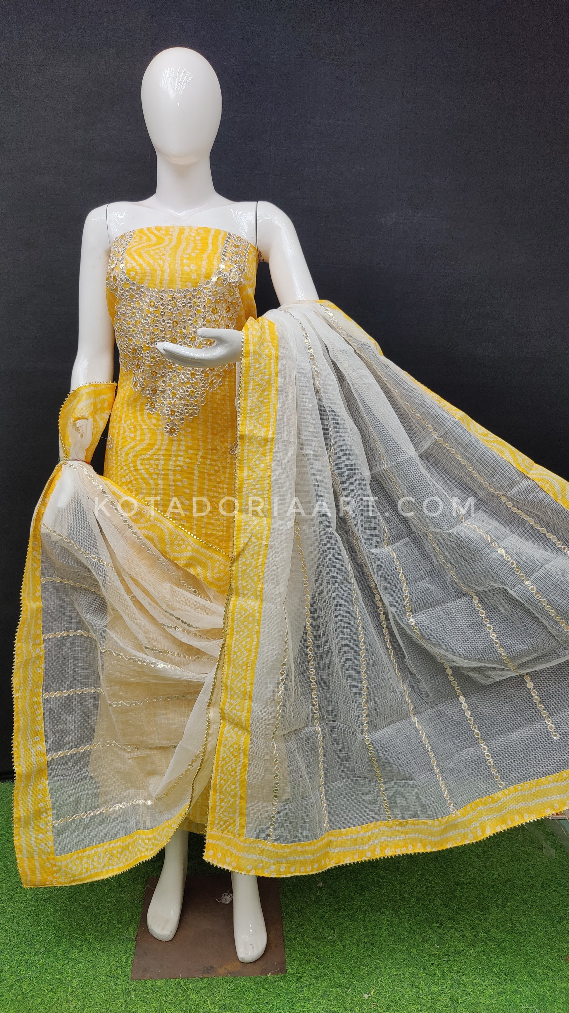 Yellow Bandhej Kota Doria Cotton Gota-Patti Work Dress Material