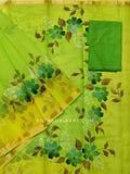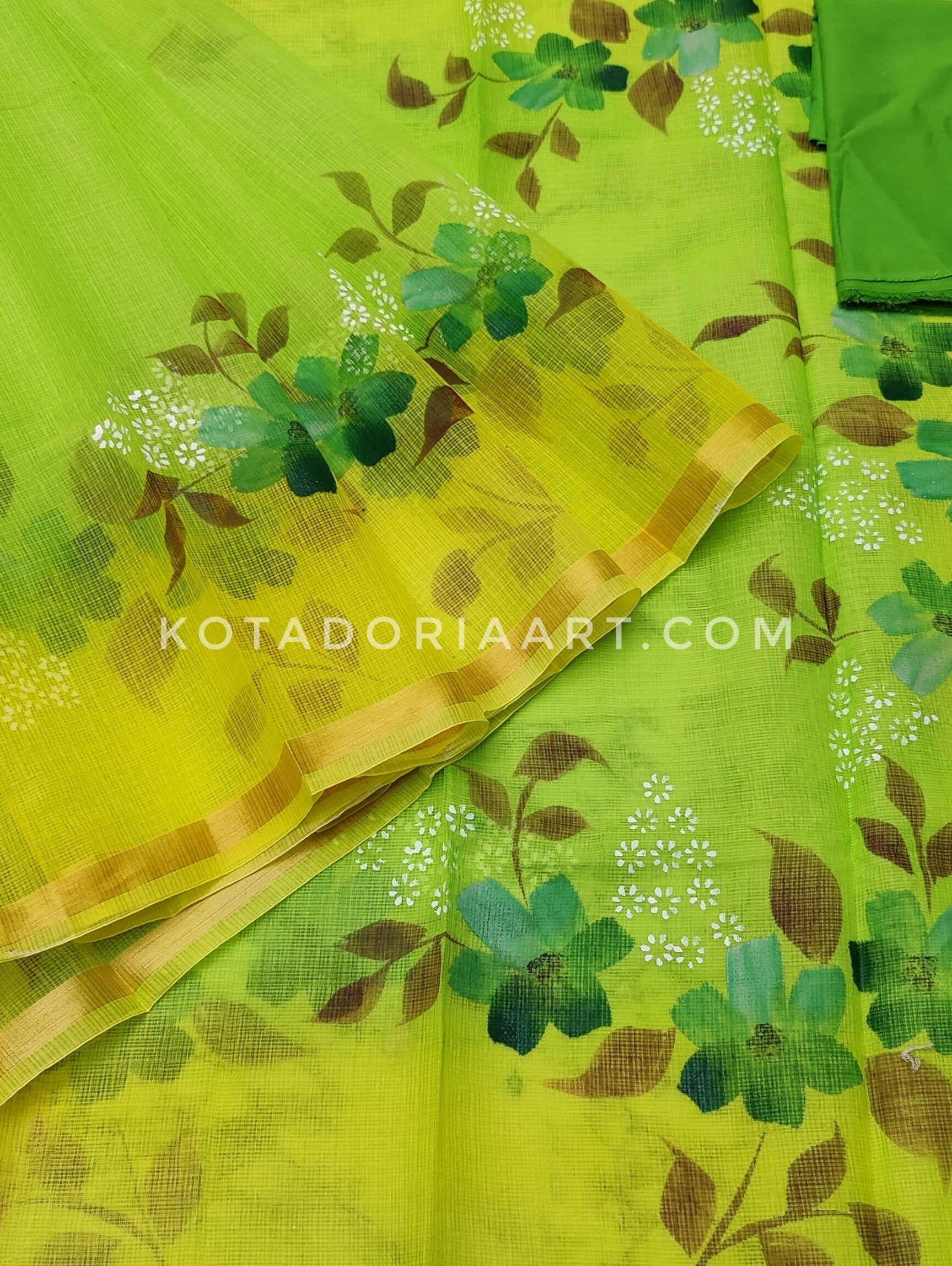 Green Cotton Kota Doria Hand Painted Saree With Contrast Blouse